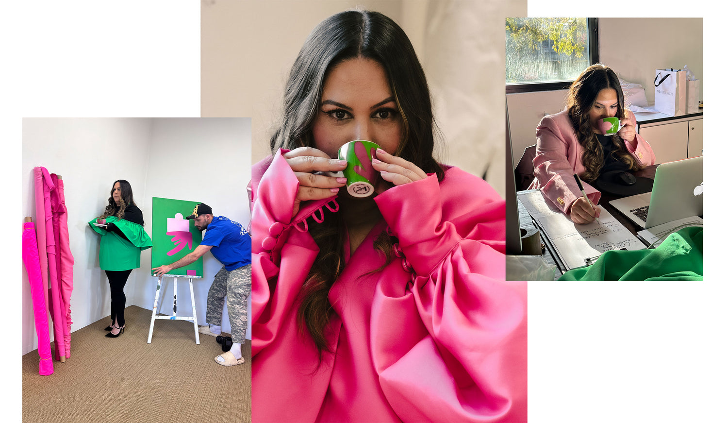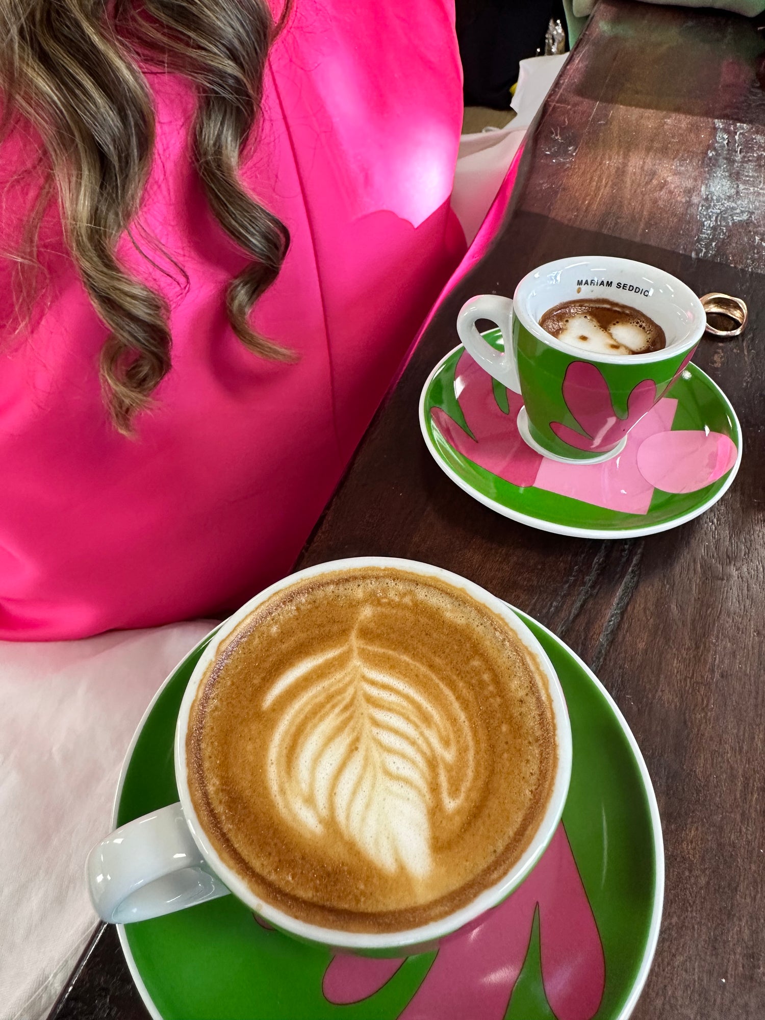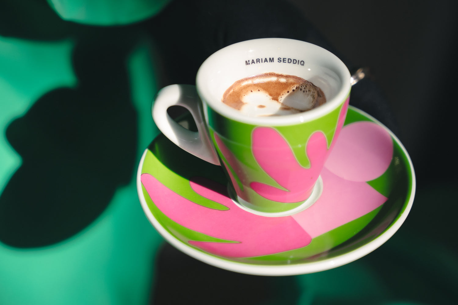 The cups feature a striking color palette of soft pink light and vibrant green, creating a harmonious balance of warmth and freshness. MARIAM SEDDIQ’s signature use of color and texture transforms each cup into a piece of functional art, designed not only to enhance your coffee ritual but to bring a touch of elegance to any setting.