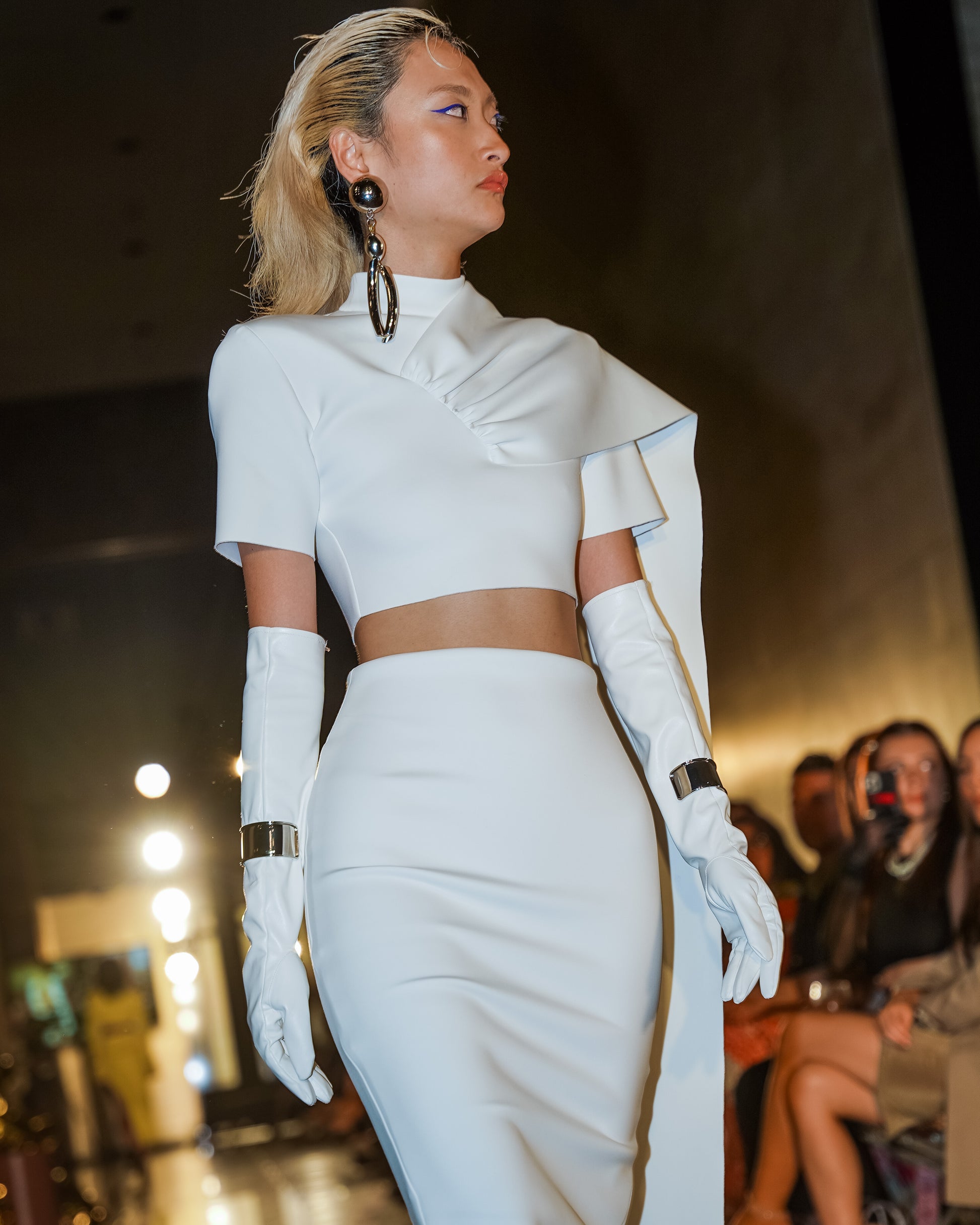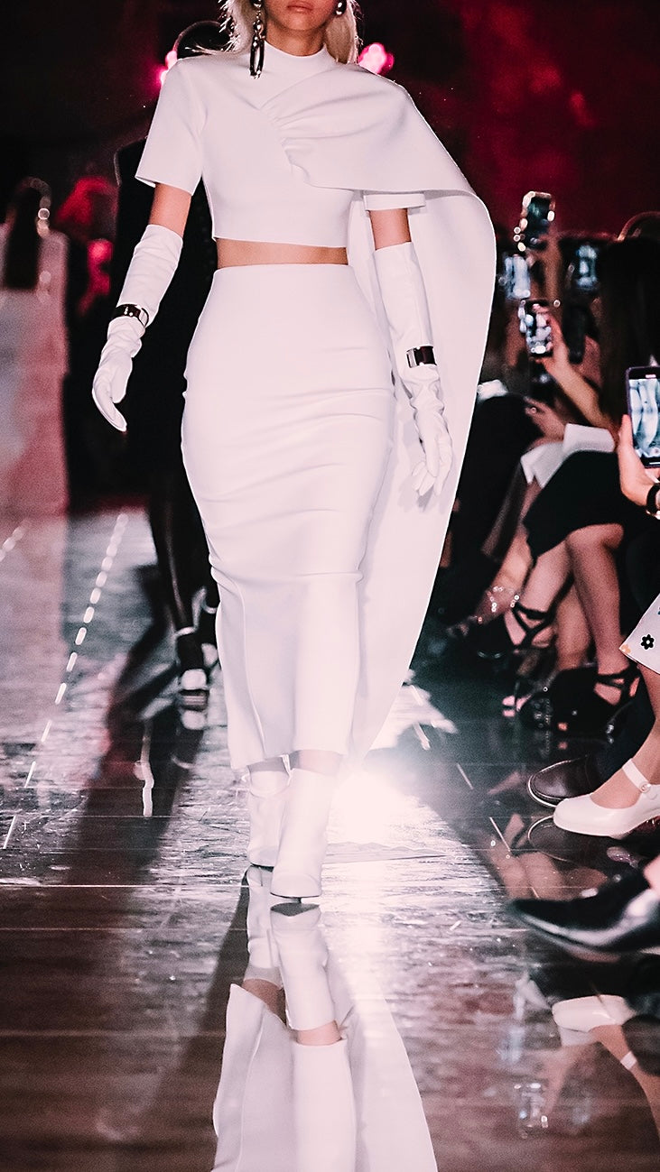 POWER SHOULDER CROP WITH SHOULDER CAPE DETAIL WITH MATCHING MIDI SKIRT. WATER RESISTANT SOFT SCUBA FABRIC.