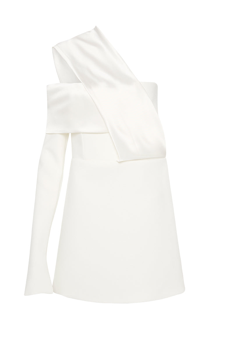 ONE SHOULDER LAYERED CUFF AND SLEEVE MINI DRESS.