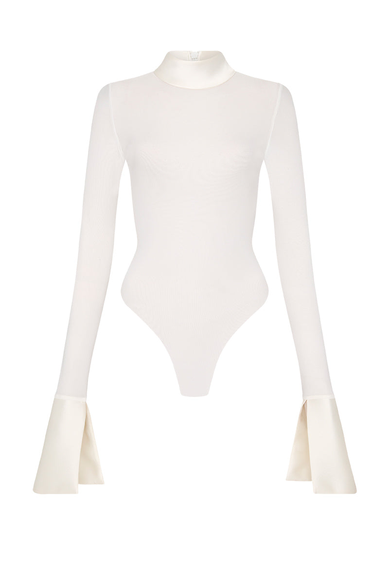TRANSPARENT MESH BODYSUIT WITH STATEMENT CUFF AND COLLAR.