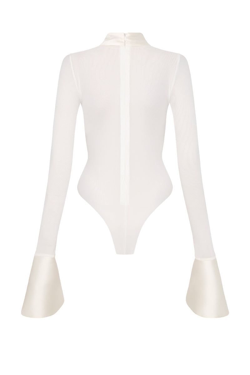 MESH BODYSUIT WITH STATEMENT CUFF AND COLLAR.