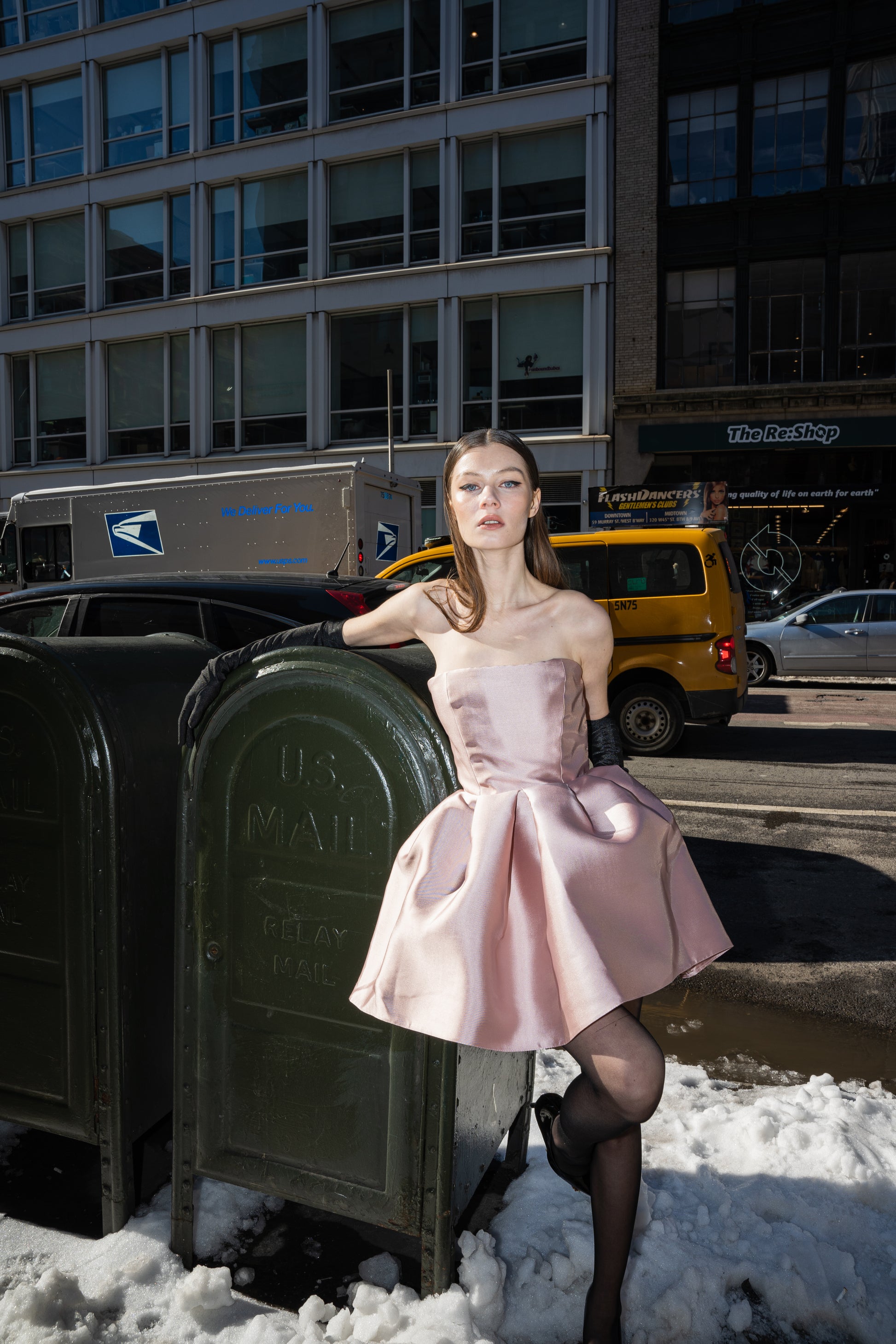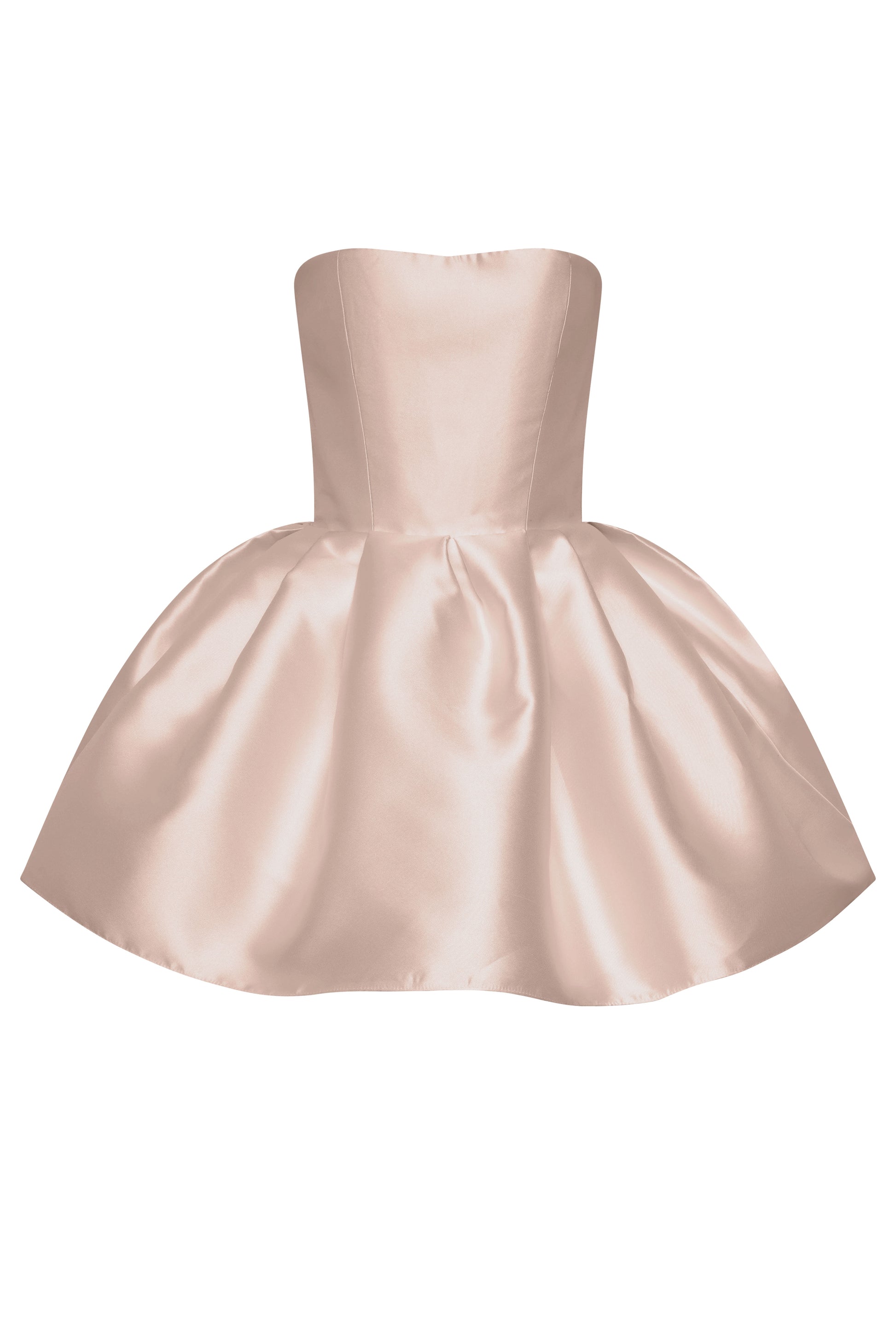 ELEVATE YOUR WARDROBE WITH THE MARIAM SEDDIQ 'HARPER' SANDY BLUSH MINI, FEATURING A STRAPLESS, BONED BODICE AND FULL TUCKED SKIRT FOR A FLATTERING, ELEGANT SILHOUETTE. PERFECT FOR A NIGHT OUT OR SPECIAL OCCASION.