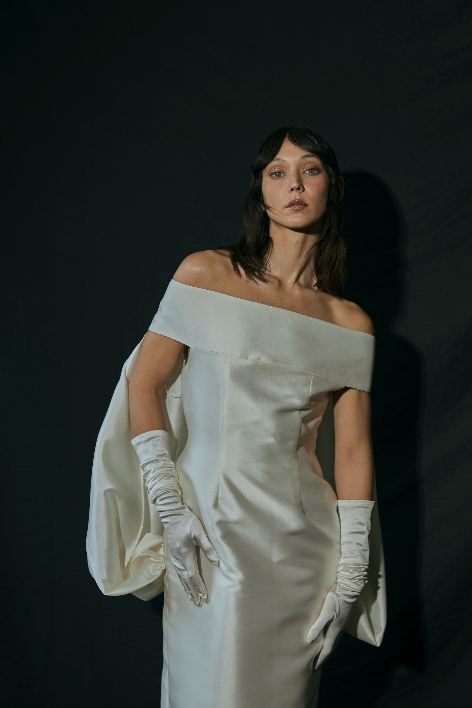 OFF SHOULDER BALLOON CAPE GOWN