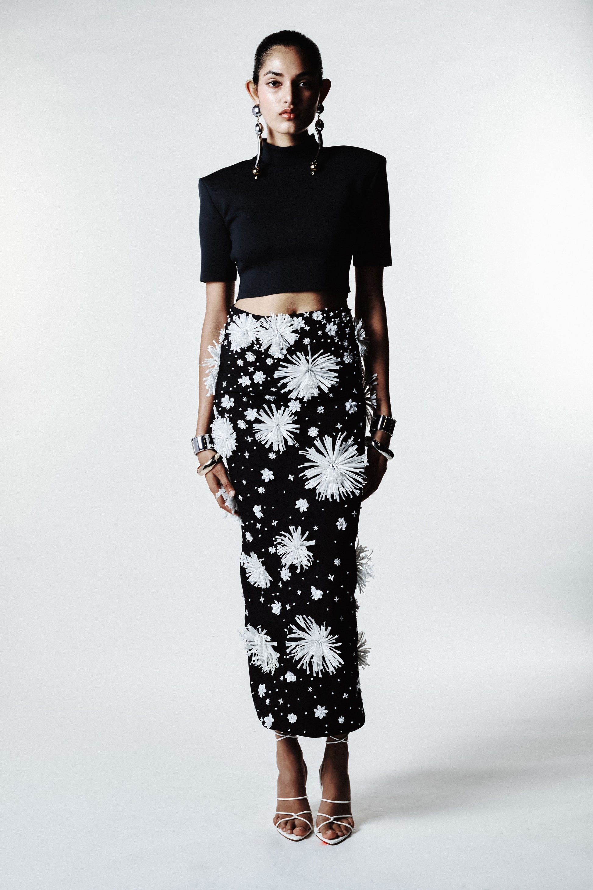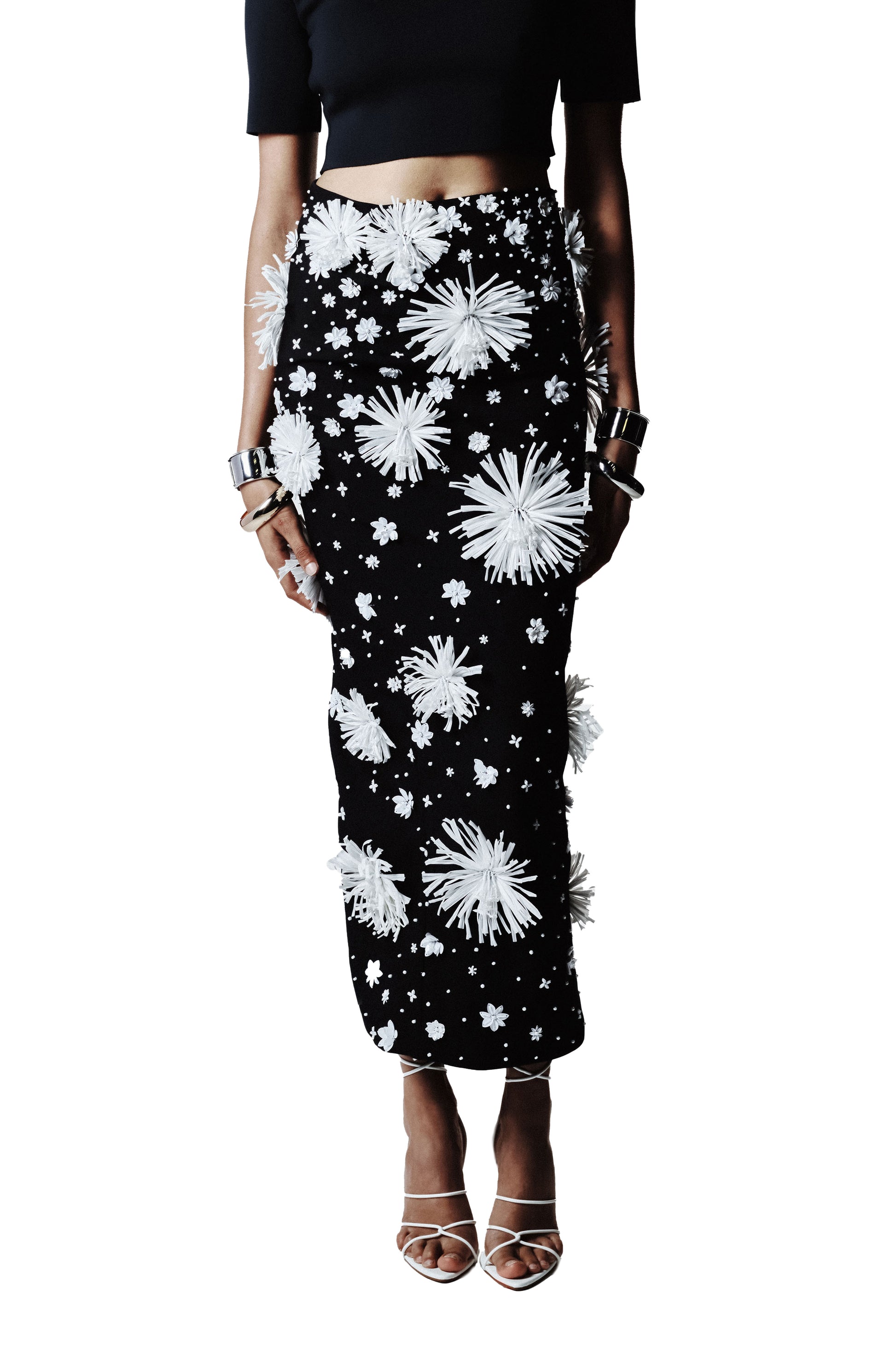 BLACK AND WHITE MIDI SKIRT WITH HAND BEADED FLOWER DETAIL.