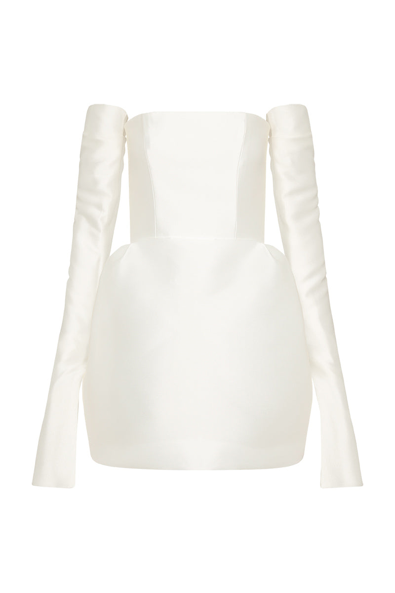 STRAPLESS SIDE PUFF MINI WITH DETACHABLE CUFF SLEEVES.