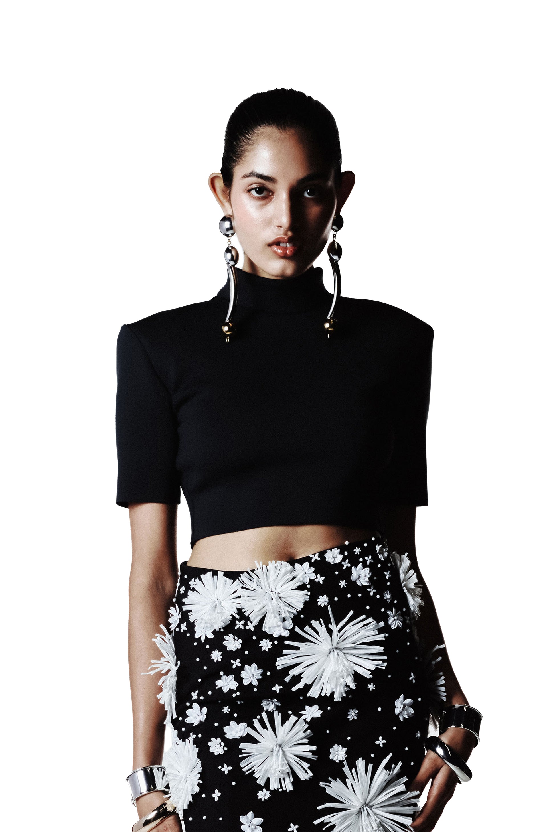BLACK STRUCTURED HIGH NECK CROPPED TOP WITH SHORT SLEEVES.